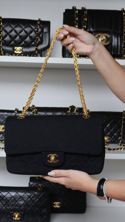 Een klassieker, met een twist. Een Chanel Medium Classic Double Flap, dit keer in een bijzondere uitvoering. Gemaakt van een zachte zwarte katoenen stof, met 24K gouden hardware. Tijdloos maar toch uniek, ook met de reissue ketting. En niet onbelangrijk: een schitterende prijs voor zo'n Chanel klassieker.